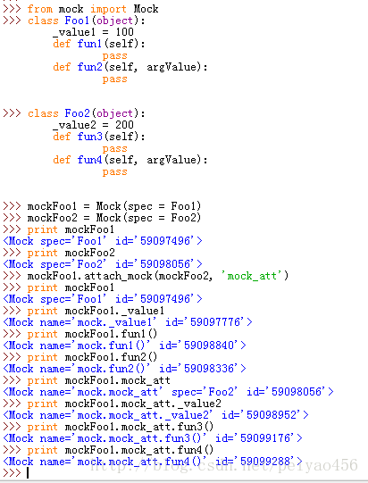 上述例子中,我们是将mockFoo2添加到mockFoo1中,并重新命名为mock_att。或许,看到这里,你会很好奇,为什么mockFoo1._value1取到的不是100,而是一些id信息呢?因为,哈哈哈,spec只是设置的是mock对象的属性,也就是说mock对象有这些属性,但是属性的值呢~~就说不定了~