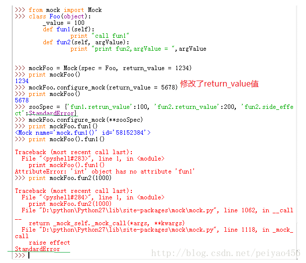 (value值也必须带上引号,但是最后那个异常就不需要了),这样子纠正之后,print mockFoo.fun1()显示的结果就是100.