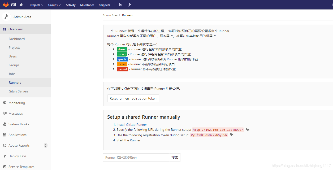 如果要注册Shared Runner,你需要到管理界面的Runners页面里面去找注册token。如下图所示