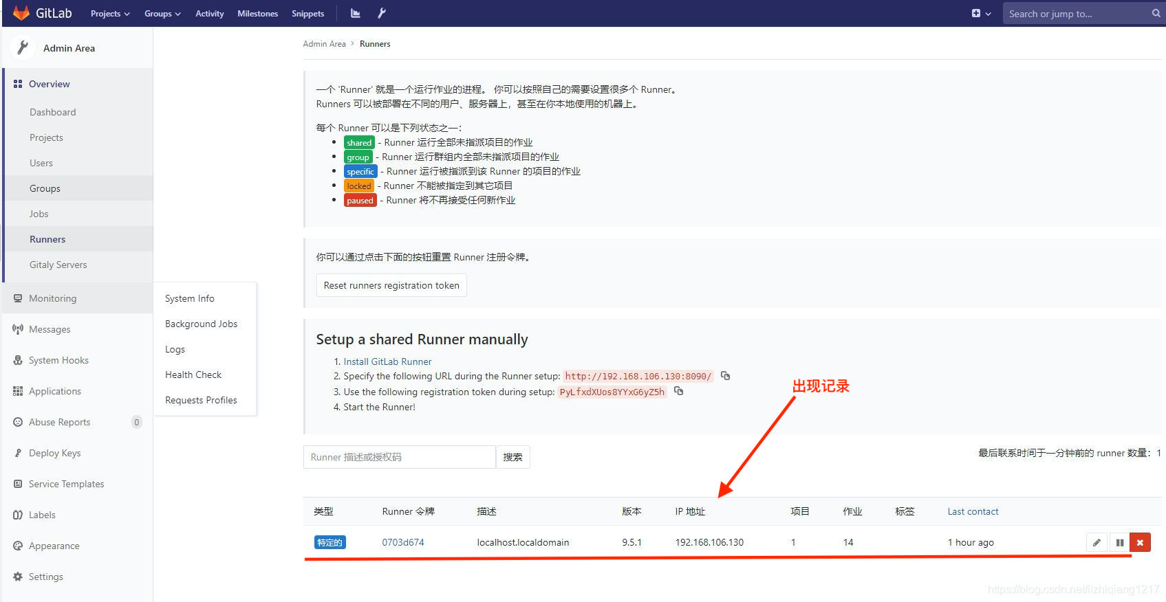 注册完成之后,GitLab-CI就会多出一条Runner记录