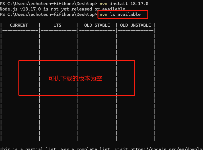 然后试着使用 nvm ls available 来列出所有可供下载的版本,发现为空:
