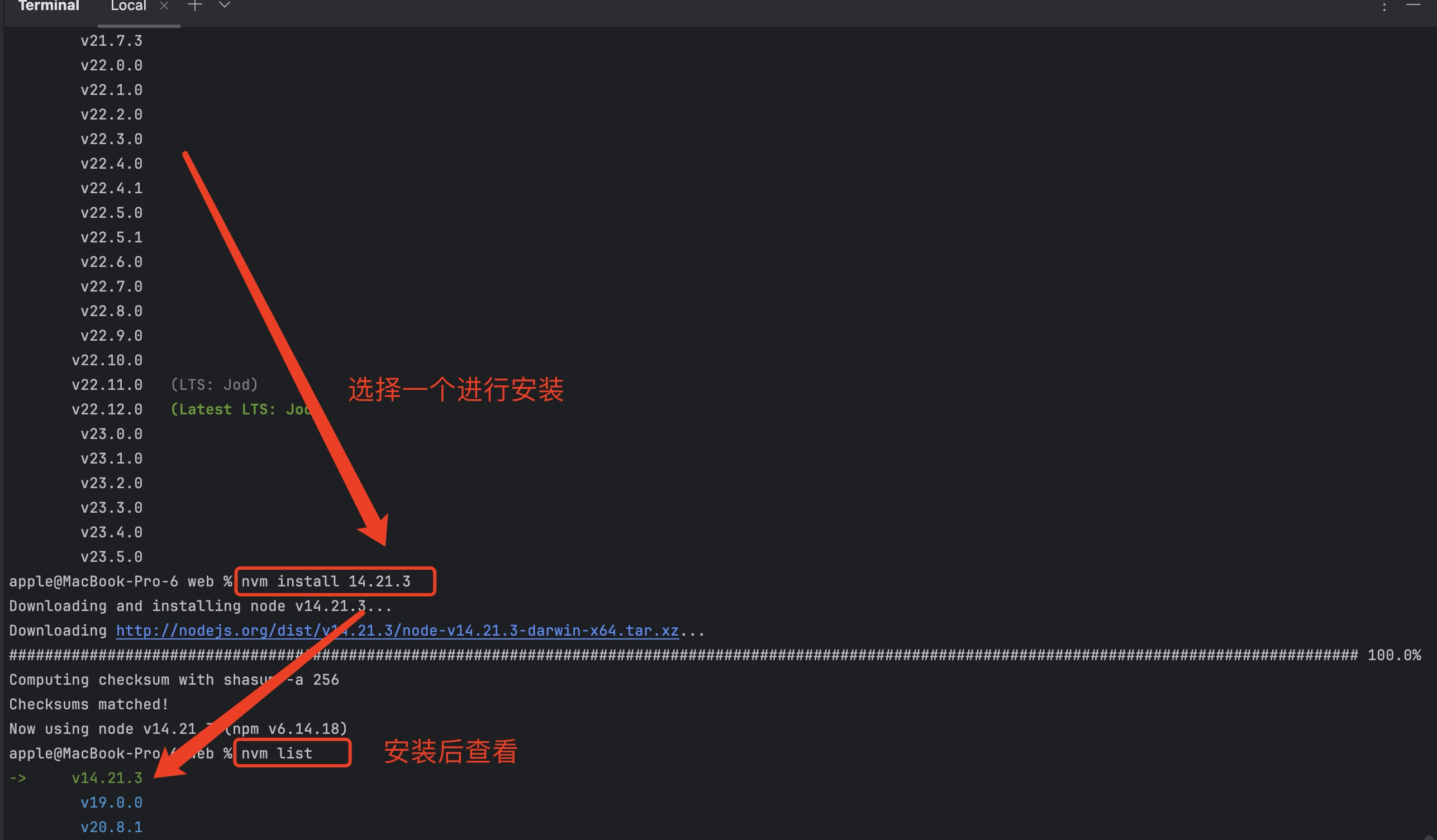 8、开始安装不同的node版本 nvm install 版本号, 例如:nvm install 14.21.3 安装完检查node版本是否已成功安装 node -v