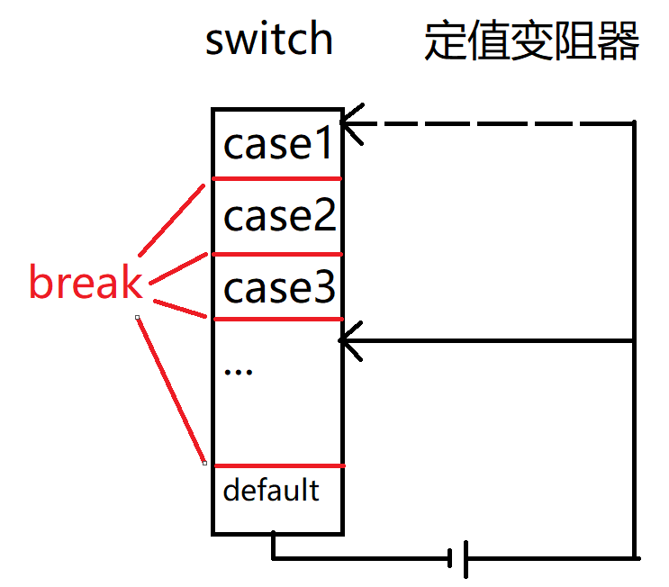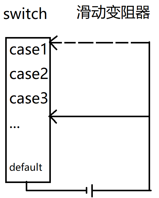 如果符合的case后都没有break那么就会从此case一直输出到最后,类似于滑动变阻器