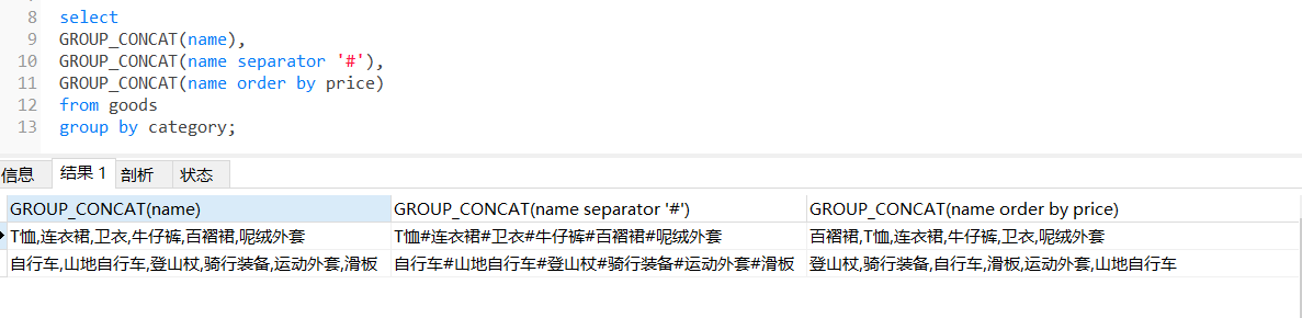 三:GROUP_CONCAT([DISTINCT] 要连接的字段 [Order BY ASC/DESC 排序字段] [Separator '分隔符'])