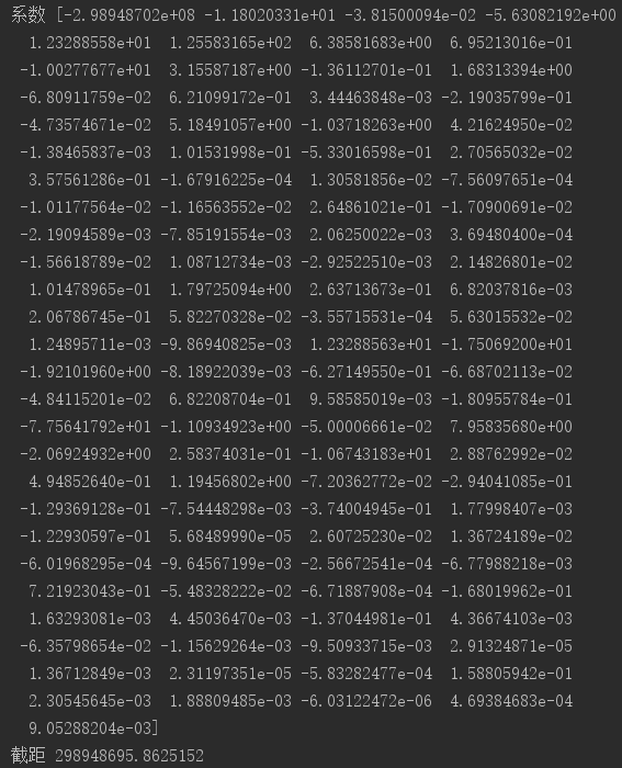 4 print('系数', mlr.coef_, "\n截距", mlr.intercept_)