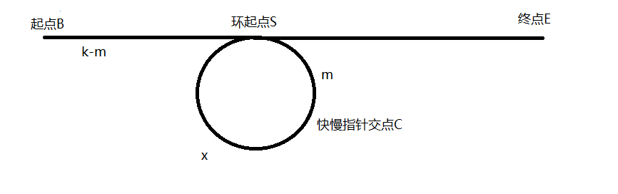 我们假设慢指针走了 k 的距离,那么快指针走了 2k 的距离,其中(0<k<2k<n),设 SC 的距离为m,注意是顺时针(S到C)的距离,那么: