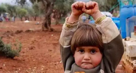 叙利亚一个小女孩,在摄影师举起长焦镜时,她紧咬着嘴唇默默举起了双手,以示投降,因为她以为那是一把枪。在战争中长大的孩子,眼神里既有恐惧,也有镇定。