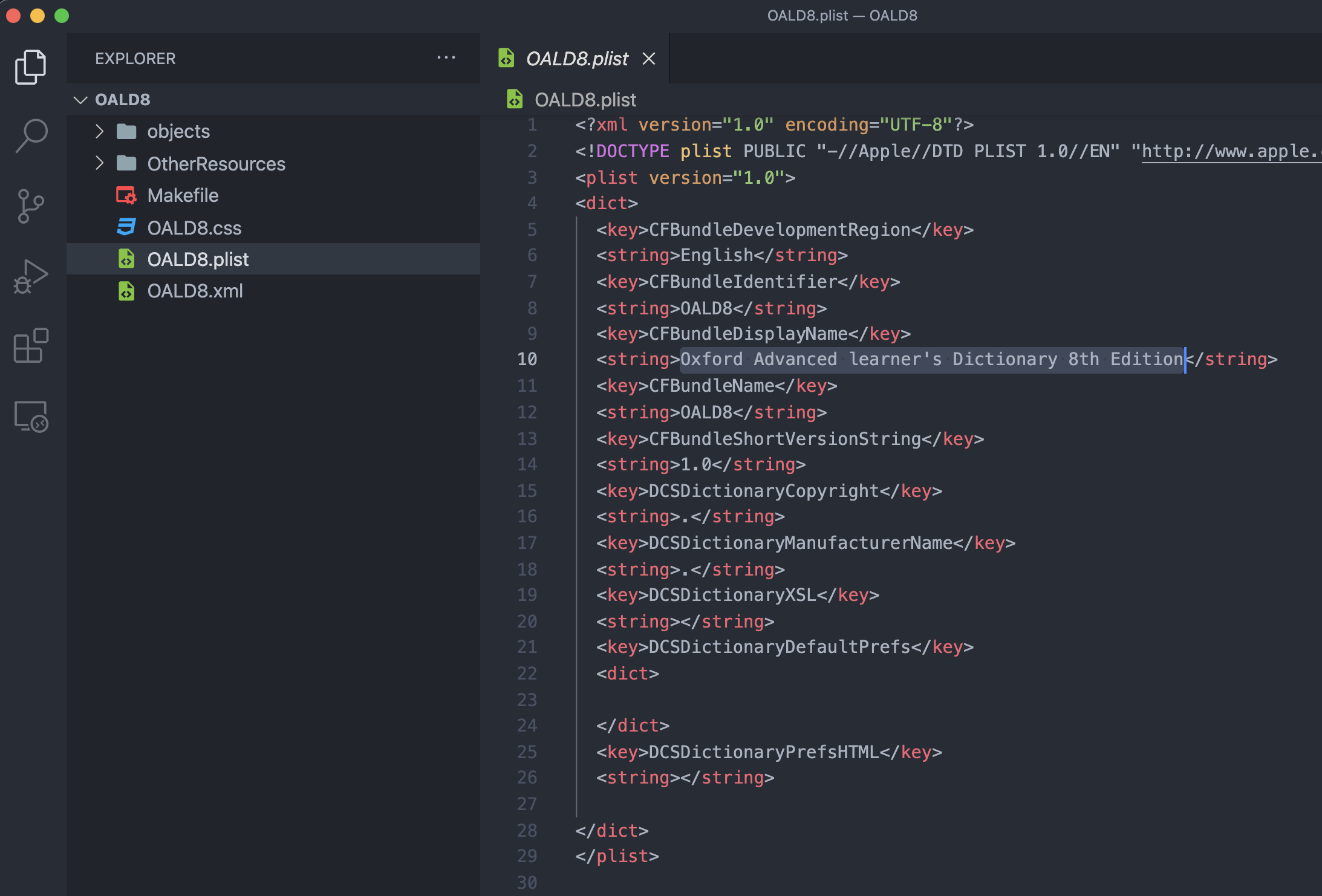 在.plist文件第10行更改的CFBundleDisplayName值,这将会是是词库在词典显示的名字