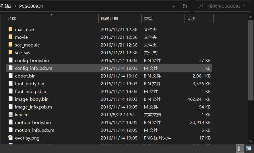 下面的文件都是未知格式xxx_body.bin和xxx_info.psb.bin等,而且是成组的,可以看到有几个占了很大内存,猜测游戏本体就是由这些文件组成。