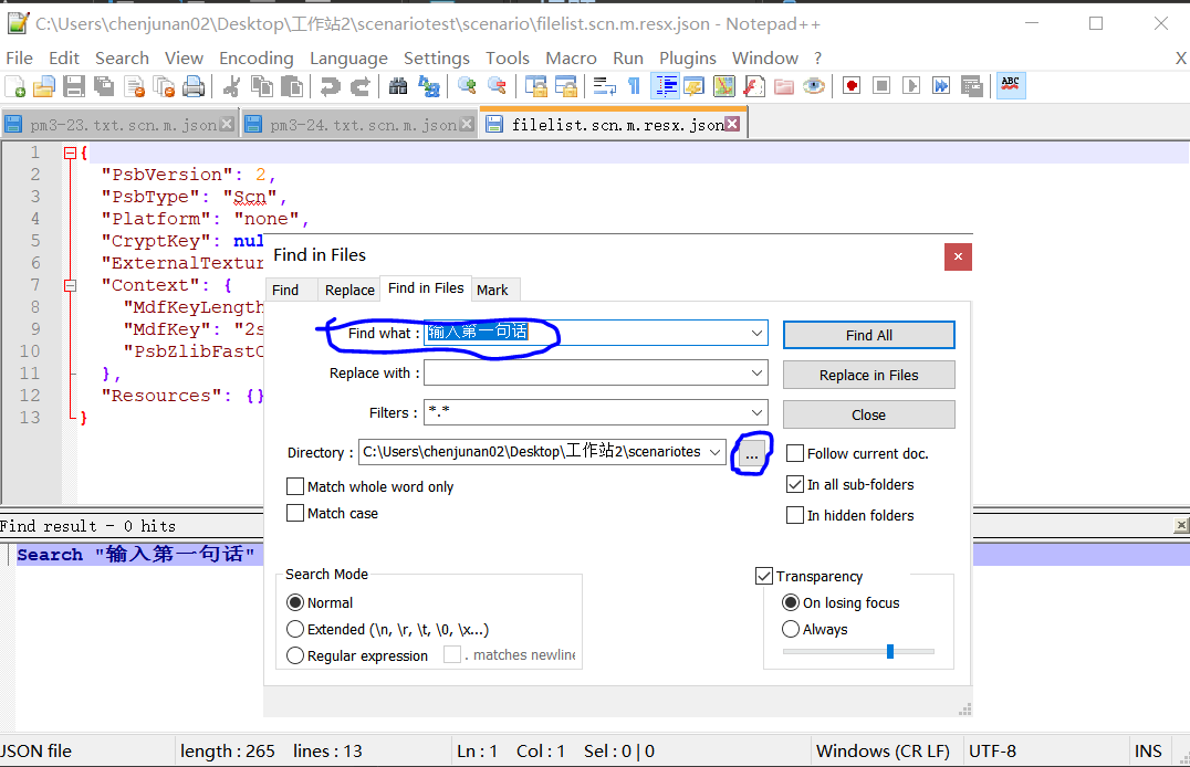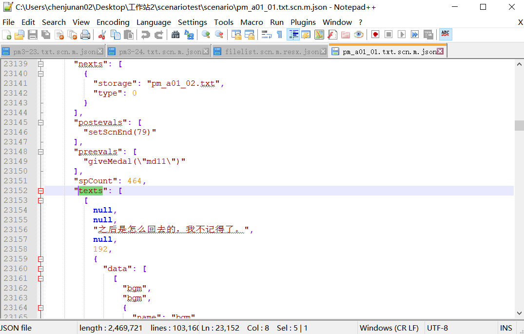 文件夹内也是json文件。先在psv上打开游戏看一下游戏第一句话,记下来。用notepad随便打开一个json文件,search一下全文件(指定搜索路径可以提高效率)是否存在第一句话,有的话则说明文本已经解出来了。接下来只要找到文本文件即可。
