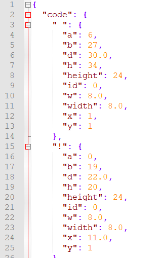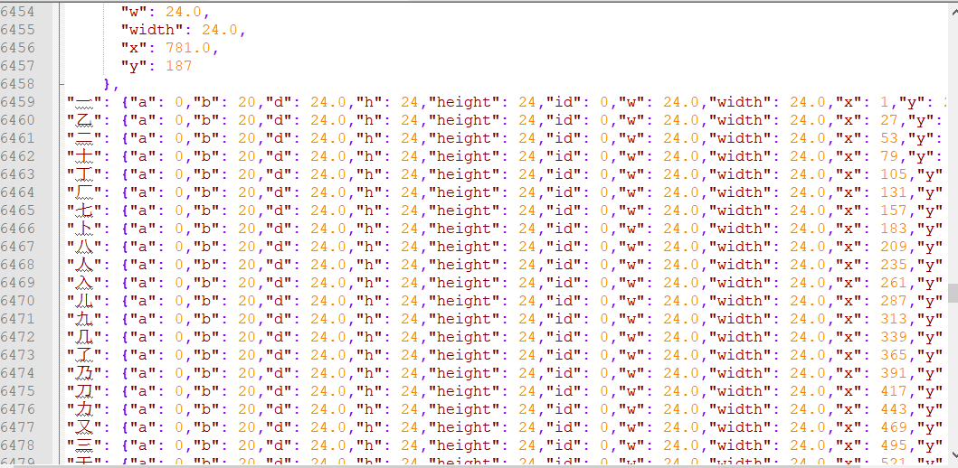 1 if __name__ == '__main__': 2 alljs = [] 3 jstext = [] 4 x = 1 5 y = 213 6 7 # get words 8 fp = open(r'F:\pycharm\xxxxxxx\3500字_new.txt','r',True,encoding='utf-8-sig') 9 while True: 10 word = fp.read(1) 11 if not word: 12 break 13 unit = '"first": {"a": 0,"b": 20,"d": 24.0,"h": 24,"height": 24,"id": 0,"w": 24.0,"width": 24.0,"x": second,"y": third}' 14 unit2 = unit.replace('first',word) 15 jstext.append(unit2) 16 fp.close() 17 18 # change x,y 19 for i in range(1,46): 20 for j in range(1,79): 21 flag = (i-1)*78+j 22 if flag <= 3500: 23 str01 = jstext[flag-1].replace('second',str(x)) 24 str02 = str01.replace('third',str(y)) 25 alljs.append(str02) 26 x = x + 26 27 print('完成{0}行'.format(i)) 28 x = 1 29 y = y + 26 30 print('完成') 31 32 # write file 33 fp02 = open(r'F:\pycharm\xxxxxxx\font24.txt','w+',encoding='utf-8') 34 for m in alljs: 35 m = m + ',' + '\n' 36 fp02.write(m) 37 fp02.close()