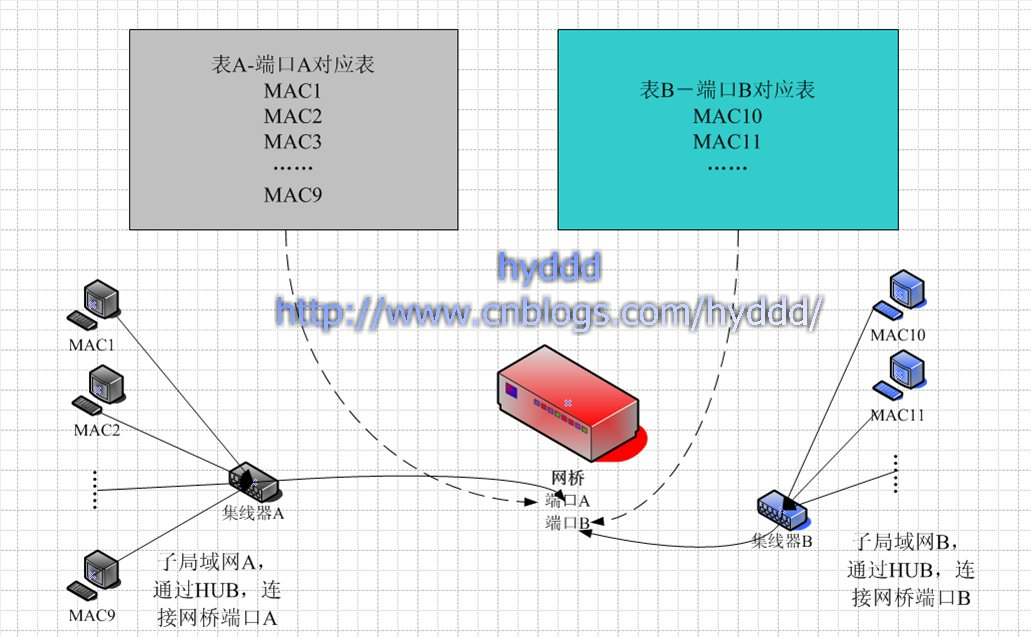 这里我觉得要明确的是,网桥不是用来连接不同网段的!!!我当初被这个问题害惨了,K了N多资料,不过还好,有点收获:>,不同网段之间通信,需要网关的帮助,它一般是路由器这类网络层的设备。网桥或交换机是链路层设备,网段这个是和IP相关的概念,属于网络层。网桥和交换机跟本无能力去处理网络层的东西!如果非要说用网桥和交换机去连接两个不同网段的网络不是不行,只是没有作用而已,因为不同网段机器的始终是不能互访问,网桥不能做网关!上面我已经说了网桥的由来,它是为了减少HUB的广播,提高局域网网络性能出现的,网桥连接的仅仅是两个子局域网,并且这里说的子局域网必须是同构的(同构的意思是:如果是以太网,那么网桥连接的两个子网都必须是以太网,不能一个是以太网一个是令牌网),我一直认为:以太网的特性导致了网桥的出现,因为广播是以太网的重要特性,其他构造的网络不一定有(呀~这里我猜的,我对其他的结构的网络是一巧不通的说-_-!),为了优化以太网的性能,网桥出现了~所以其他构造网络似乎也不需要使用网桥这个东东!其实后来带着这个想法继续看无线网络的东西,发现这个想法应该是错误的,网桥的天性应该是:连接两个同构网络,而在以太网上,刚好HUB可以作为连接两个网络的设备,但是由于HUB的各种弊端,人们研发了工作在链路层上的网桥(本文所介绍的),它除了连接两个网络的功能外,还有优化网络性能的功能。而在其他构造的网络也有网桥这个设备,但它的功能可能是仅仅连接两个网络,而没有了优化网络性能的功能(或者根据网络特性,它又有了新的功能)。