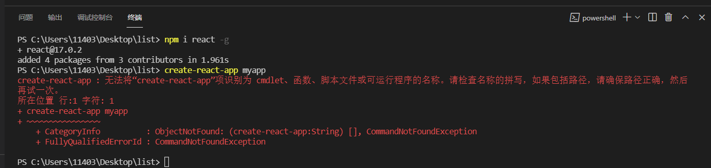问题原因:没有全局安装 “create-react-app” 脚手架导致,