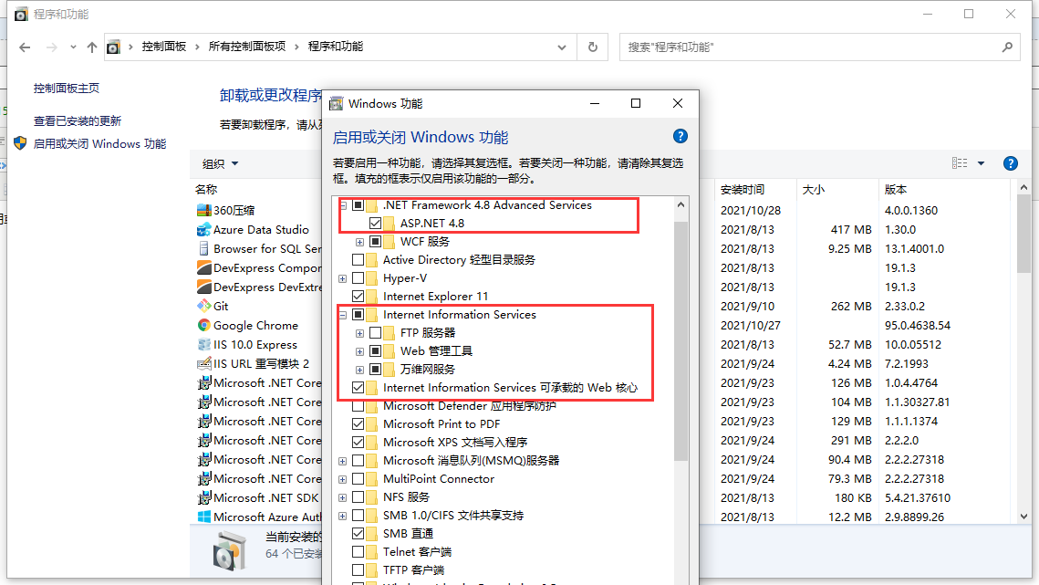 一、打开控制面板-程序和功能-启用或关闭windows功能,比较主要的几个功能都勾选一下,然后重启电脑