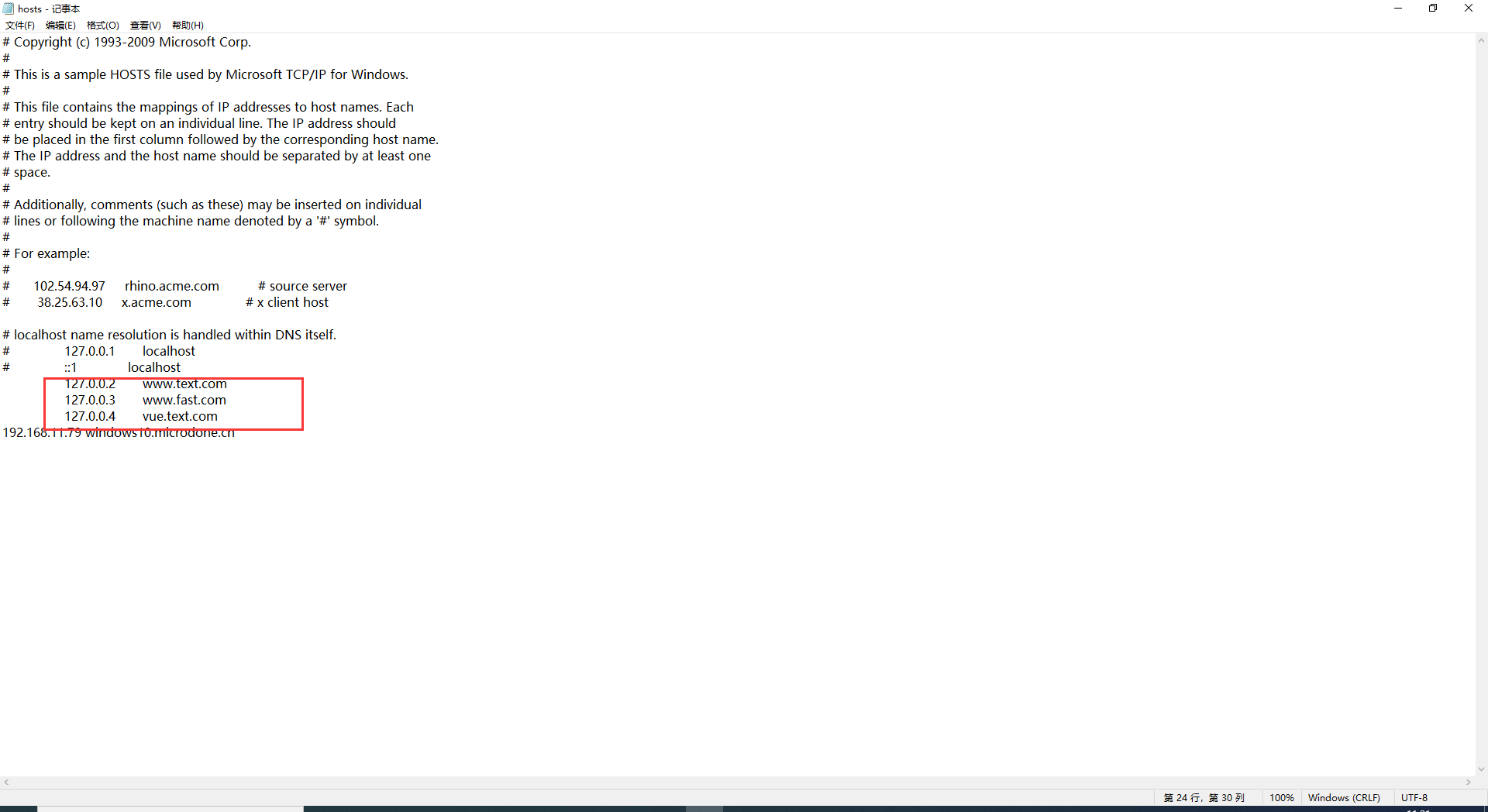 三、打开文件‘C:\Windows\System32\drivers\etc\hosts’,输入自定义的ip和域名,注意:使用管理员身份打开,否则会出现无法保存的情况。或者手动修改文件夹权限,再进行修改。