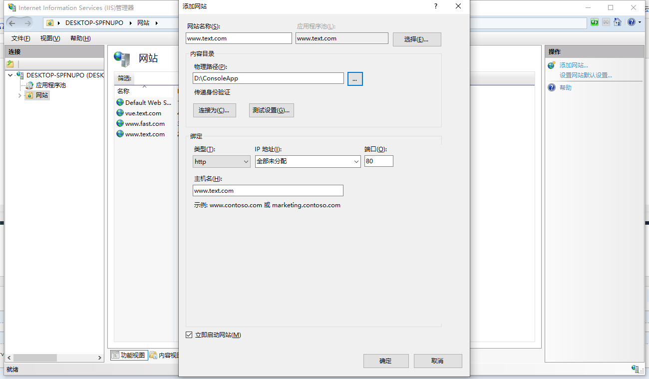 四、打开iis添加网站,到这一步整个环境就搭建好了
