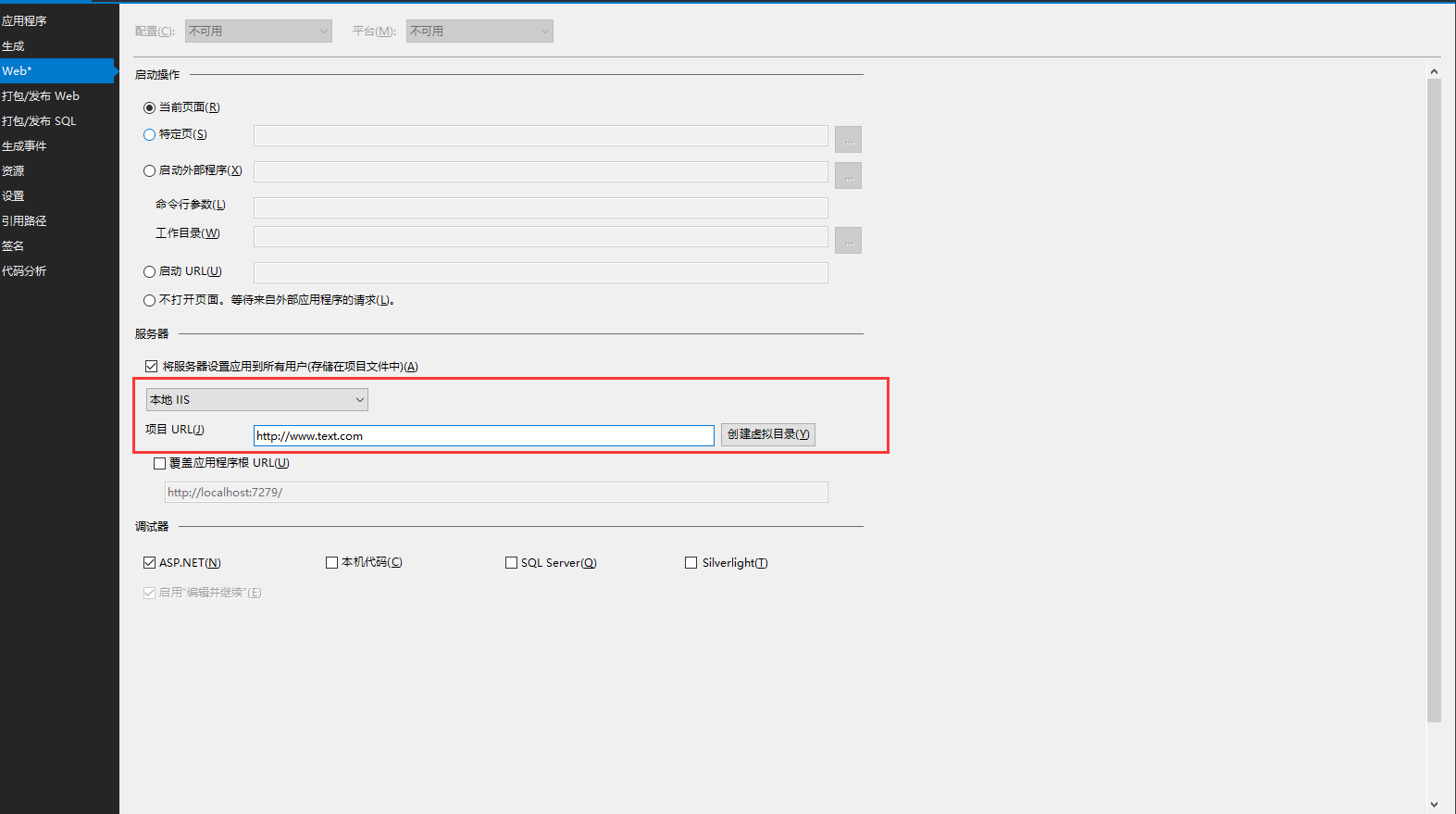 5、vs调试本地web项目,右键web项目-属性-web。选择本地iis输入域名即可。