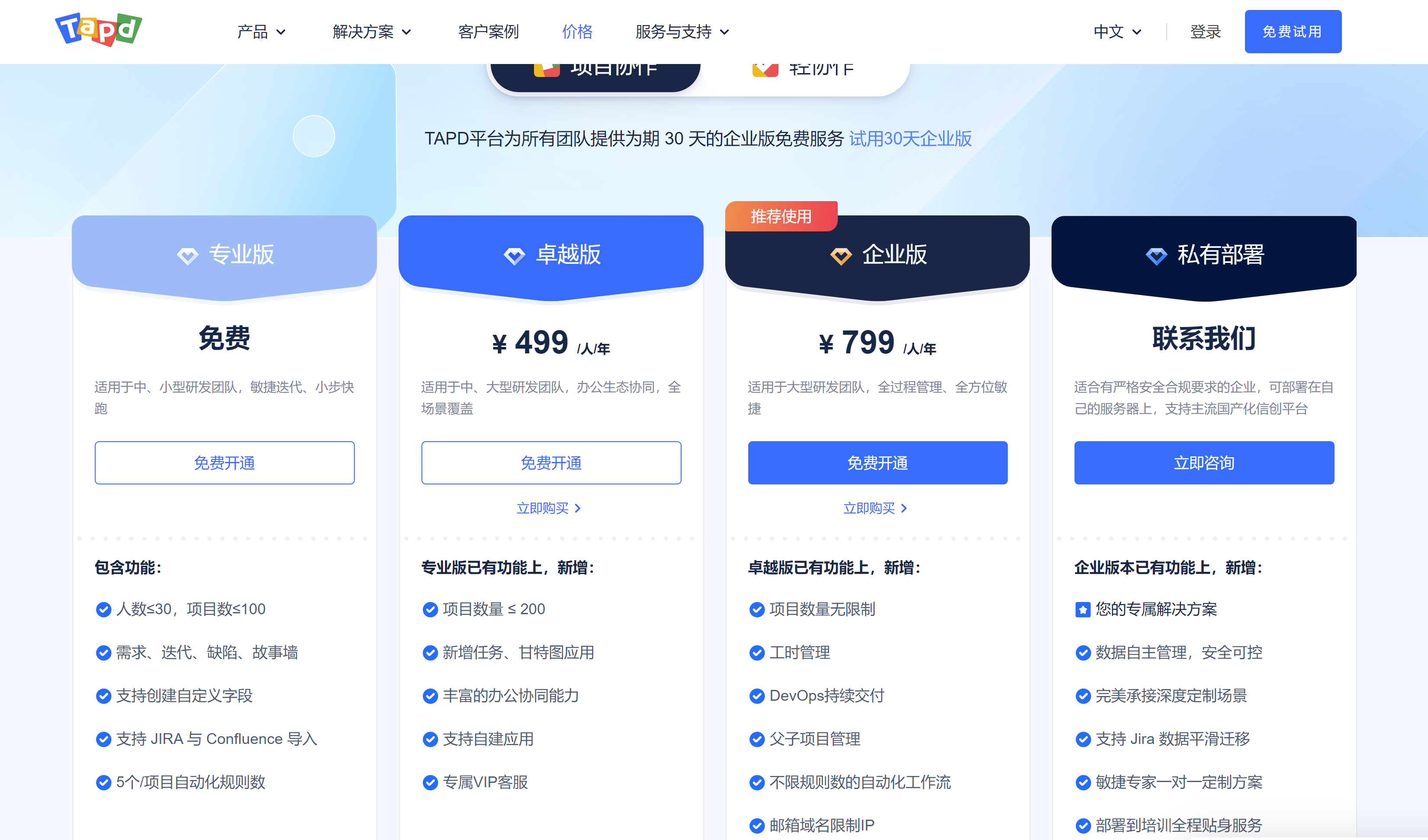 TAPD从2022年左右开始面由一个完全免费的工具向付费工具转变。从最新政策看,TAPD 针对不同规模和需求的团队,TAPD提供了多种版本,其中包括“卓越版”和“企业版”。免费版本人数规模由原来的100人不断缩小,2024年仅支持30人以内免费,还限制了项目数量。