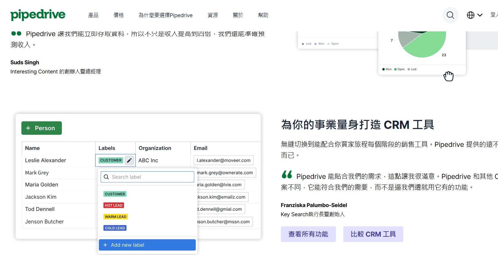 适用场景:Pipedrive特别适合中小企业和初创公司使用,帮助这些企业高效管理销售管道和客户关系。其灵活的集成功能,也适用于需要多工具协同工作的企业。