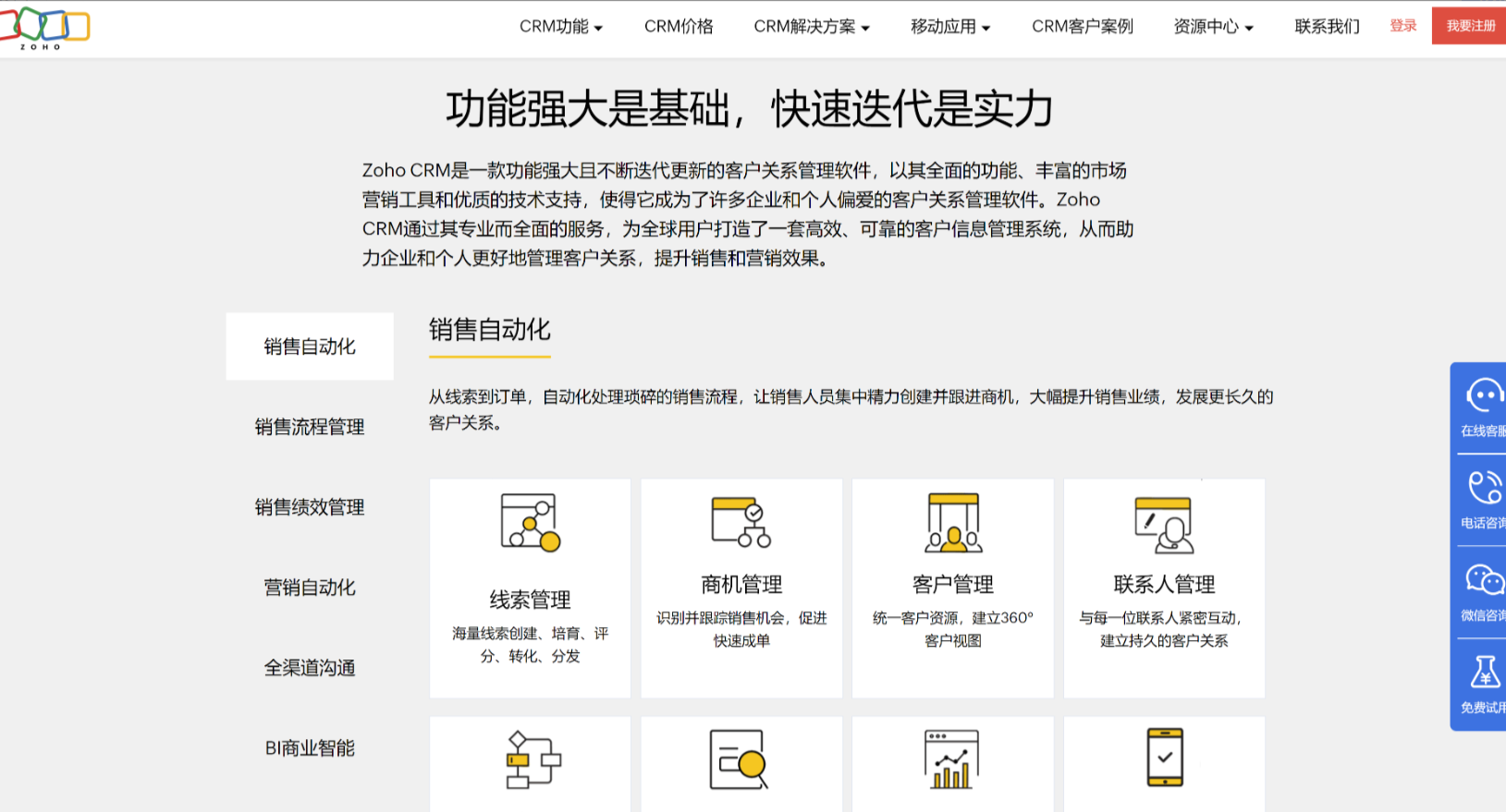 主要功能:Zoho CRM 提供多元化的管理功能,包括销售自动化、多渠道沟通、客户数据分析等。系统内置的 AI 销售助手可以优化销售流程,自动化常规的销售、市场和支持功能,减少手工数据录入和冗余工作。此外,Zoho CRM 的联络管理功能能实时提供关于客户的深入见解,帮助建立更坚固的客户关系。