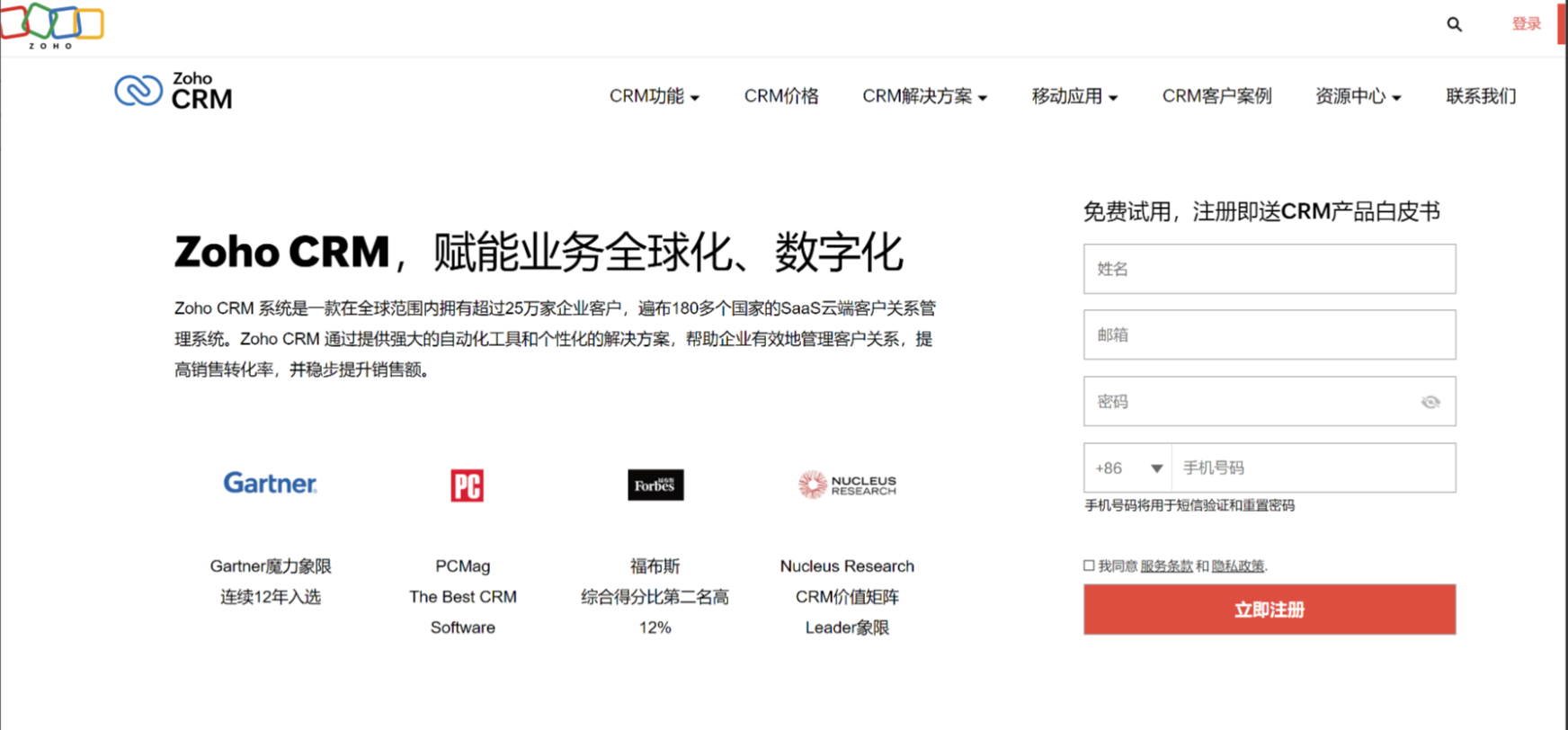 概述:Zoho CRM 是一款非常适合国内中小企业、外贸企业的CRM软件。Zoho CRM被超过 250,000 家企业在 180 个国家使用。连续12年入选Gartner SFA魔力象限报告,并在2023年荣获”Gartner 魔力象限-销售自动化远见者”称号,超过25万家企业正在使用Zoho CRM,其中包括网易、亚马逊等。