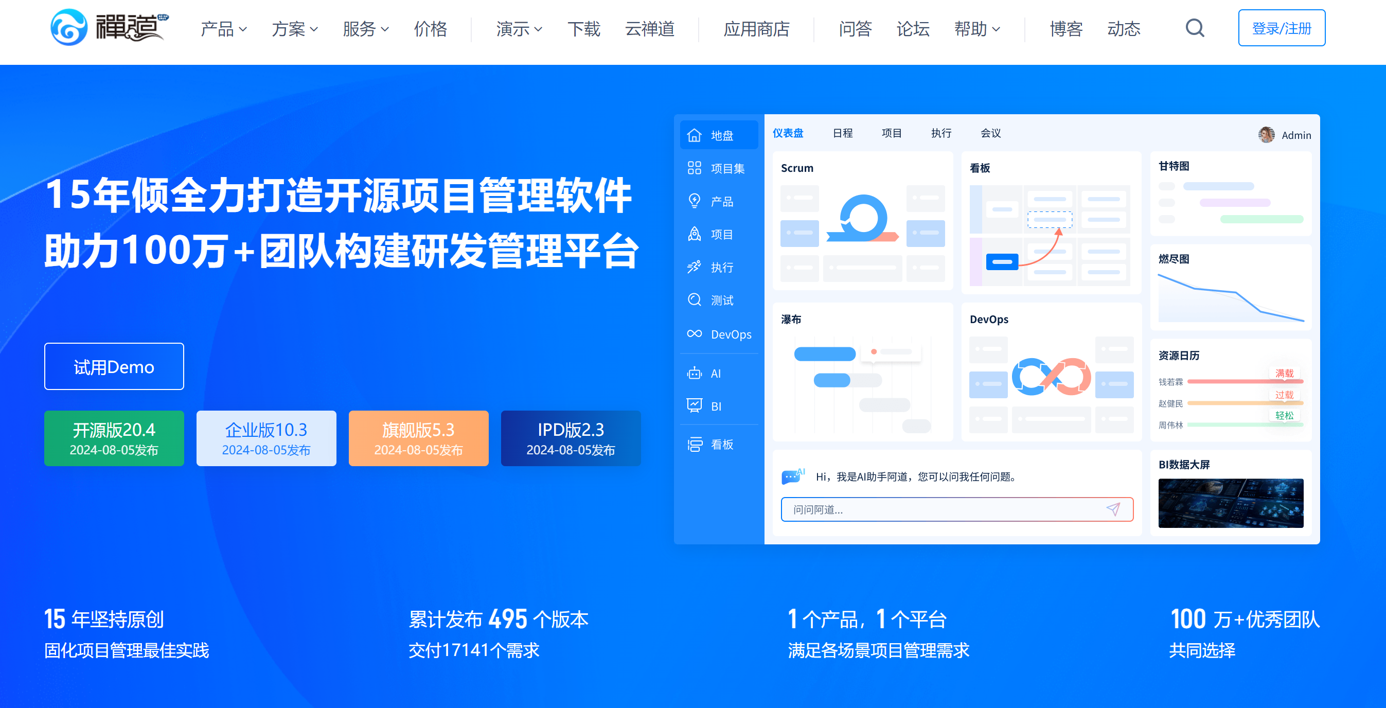 禅道是一款国产的开源项目管理软件,专注于研发项目管理。它在国内市场占有率名列前茅,结合国情在全面支持敏捷方法Scrum的基础上提供了丰富的功能,如甘特图、文档、计划、待办等,以适应不同公司的管理场景。