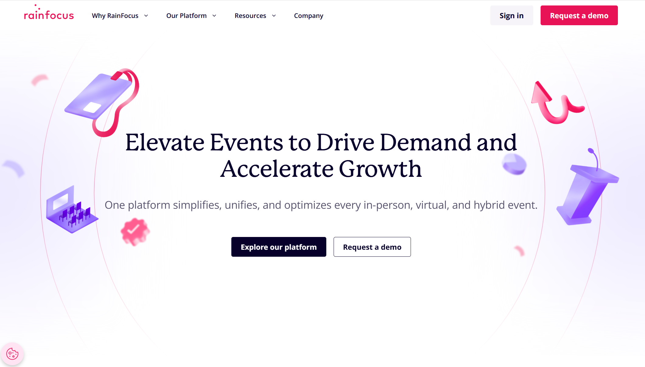 适用场景:RainFocus特别适用于需要高效管理大型活动的企业,如会议、展会、企业培训等。它也非常适合那些需要在活动中实时收集和分析数据的组织,帮助他们优化参会者体验,并在未来的活动中进行更精准的策划和执行。