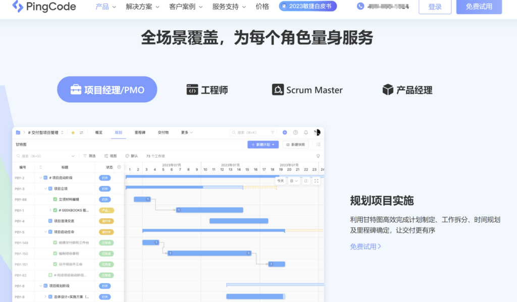 PingCode 是一款国产项目管理工具,连续多年入选36氪发布的中国软件项目管理软件榜单前二。非常适合研发项目团队使用。知名客户包括小红书、长城汽车、清华大学、中国电信等。PingCode功能上能够满足客户反馈、产品需求规划、开发、编码、构建、测试、发布上线、效能度量等开发全流程管理。支持 敏捷开发 、瀑布开发、看板项目管理、混合项目管理。集成github、gitlab、jinkens、企微、飞书等企业管理工具。