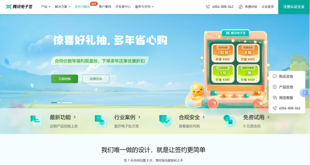 腾讯电子签的优势在于其高效的操作流程和强大的安全保障。平台可以在15秒内完成合同的电子签署,且集成了多重身份验证和合同状态追踪功能,为用户提供了便捷同时安全的电子签约体验。