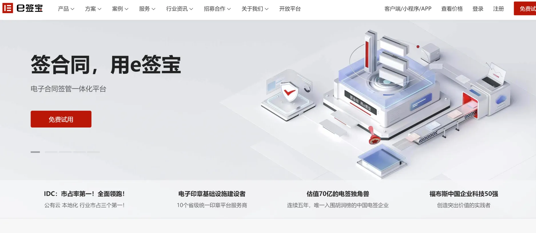 根据 IDC 等多家调研机构的报告显示,e签宝国内市场占有率最高的电子合同签章系统,也是业内唯一入选《胡润全球独角兽榜》的中国电子签名企业。已服务100多家世界五百强客户,200多家中国五百强客户,以及包含浙江省、云南省、湖北省等12个省级政府在内的150家省市政府客户。