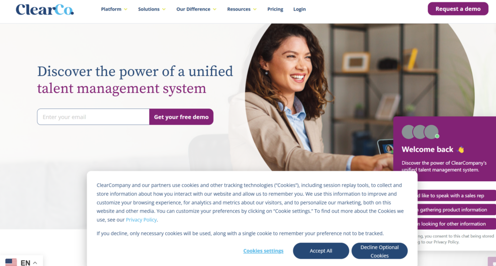 ClearCompany 的优势在于其高度集成的系统和用户友好的界面。它采用人工智能和自动化技术,能够显著缩短招聘时间,提升招聘效率。用户可以通过清晰的分析报告获取深度的HR数据洞察,从而优化决策过程。同时,ClearCompany 的平台设计注重员工体验,能够帮助企业建立良好的企业文化和团队协作氛围。
