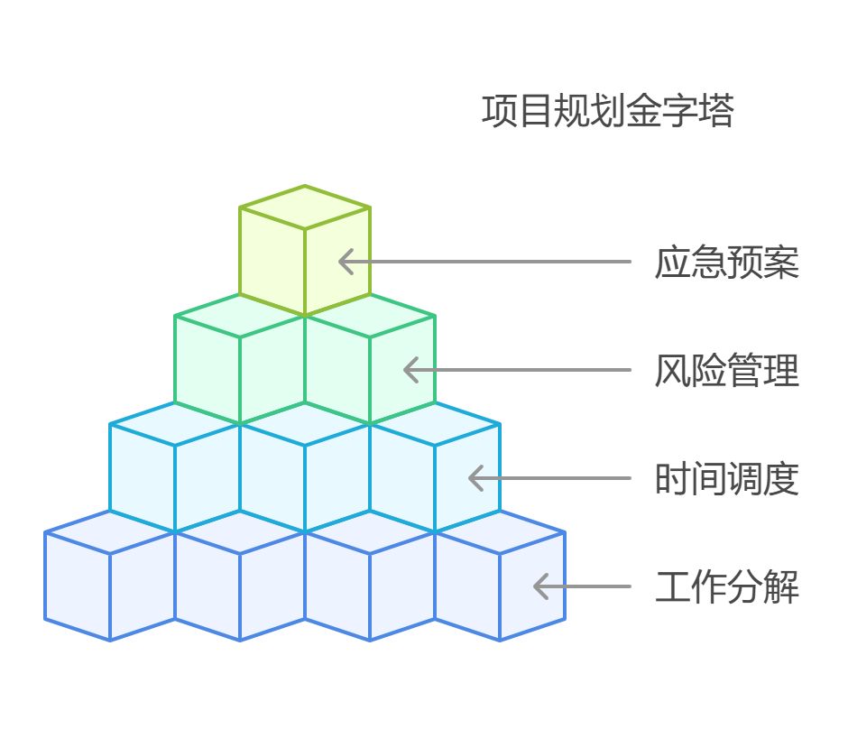 规划阶段需将抽象目标转化为具体行动方案,涵盖范围、时间、成本、质量等多维度。