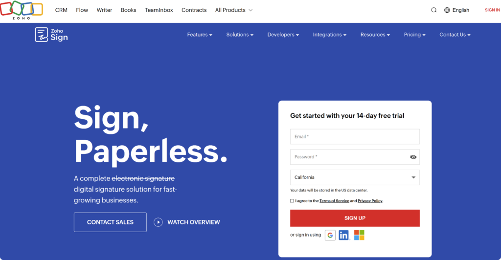 Zoho Sign 是一款专为企业打造的电子签名平台,凭借其与Zoho其他软件的无缝集成,成为很多使用Zoho生态的公司首选的签署工具。它支持多方签署、合同模板、文档管理等功能,适合需要高效管理合同的企业。Zoho Sign的强大之处在于它能与Zoho CRM、Zoho Docs等其他工具配合使用,为企业提供更加流畅的合同处理体验。不仅如此,它还支持多语言和跨平台操作,无论是通过网页端还是移动端,用户都能轻松进行电子签署。