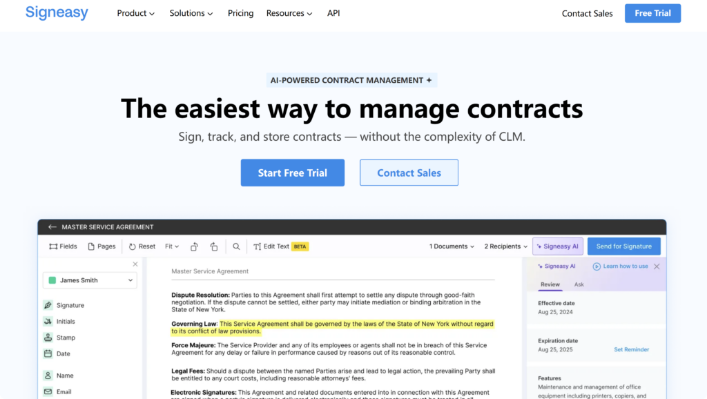 SignEasy 是一款非常受欢迎的电子签名工具,它的目标是帮助企业和个人快速、安全地完成合同签署。它的操作非常直观,用户只需要通过移动设备或桌面端上传文件、添加签名,就能轻松完成签署。SignEasy支持多种签署方式,包括电子签名、手写签名和文本签名,适应不同场景的需求。它特别适合那些需要频繁处理合同文件的公司,如中小型企业、律师事务所等。最值得一提的是,SignEasy的跨平台支持非常出色,用户可以在手机、平板和电脑上随时签署,极大提高了工作效率。