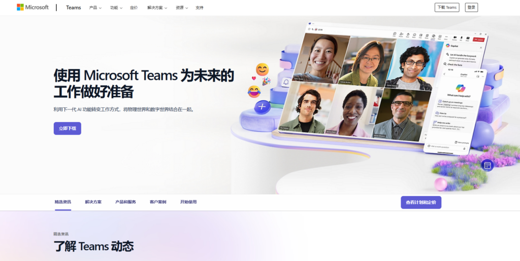 Microsoft Teams 主要功能包括即时消息、视频会议与语音通话、文件共享和实时协作编辑。它支持创建团队频道以便分组讨论和项目管理,并与微软其他办公软件无缝对接,同时提供日历、任务分配和第三方应用集成,帮助用户构建一个全面、高效的工作流管理平台。