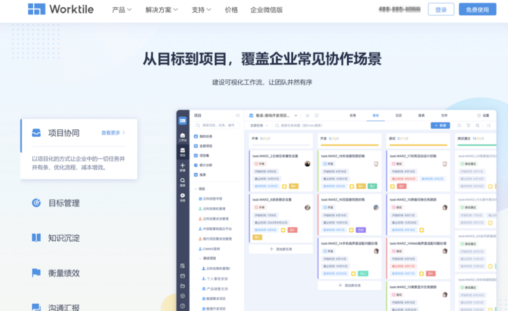 Worktile 是国内市场占有率非常高、非常知名的项目管理软件之一。塞力斯(问界)、小米、中粮集团等都有团队在使用。Worktile 是一个广泛使用的企业级协作平台,提供了包括任务管理、项目跟踪、数据统计和报表、实时协作工具、OKR 目标管理以及企业网盘等核心功能。支持自定义看板视图,项目模板,以及任务流程的全程追踪,确保项目管理的灵活性和实时性。被广泛用于电商、市场活动、律所项目、生产制造、行政、财务、设计、工程、教育、科研等几乎包含所有类型的项目管理。
