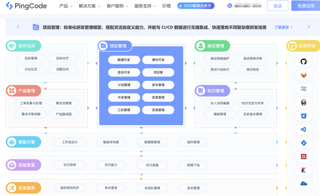 PingCode 是一款国产项目管理工具,连续多年入选36氪发布的中国软件项目管理软件榜单前二。非常适合研发项目团队使用。知名客户包括小红书、长城汽车、清华大学、中国电信等。PingCode功能上能够满足客户反馈、产品需求规划、开发过程管理、测试管理、缺陷跟踪、文档管理、跨团队协作、效能度量、目标管理等开发项目全流程管理。且支持 敏捷开发 、瀑布开发、看板、混合项目管理。集成github、gitlab、jinkens、企微、飞书等企业管理工具。