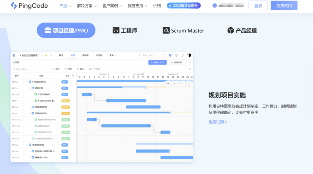 PingCode 是一款国产研发项目进度计划管理工具,连续多年入选36氪发布的中国软件项目管理软件榜单前二。知名客户包括小红书、长城汽车、清华大学、中国电信等。PingCode功能上能够满足客户反馈、产品需求规划、开发、编码、构建、测试、发布上线、效能度量等开发全流程管理。支持敏捷开发、瀑布开发、看板项目管理、混合项目管理。集成github、gitlab、jinkens、企微、飞书等企业管理工具。