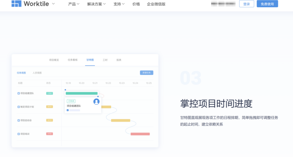 在进度计划管理方面,Worktile 支持任务拆解和分派,让项目中的每个环节都清晰可见,并提供甘特图和进度跟踪功能,使得项目的整体进展一目了然。自动提醒功能有效避免任务遗忘,而内置的报表功能则帮助团队识别进度瓶颈,为调整计划提供数据支持,非常适合需要多部门协作的大型项目团队。