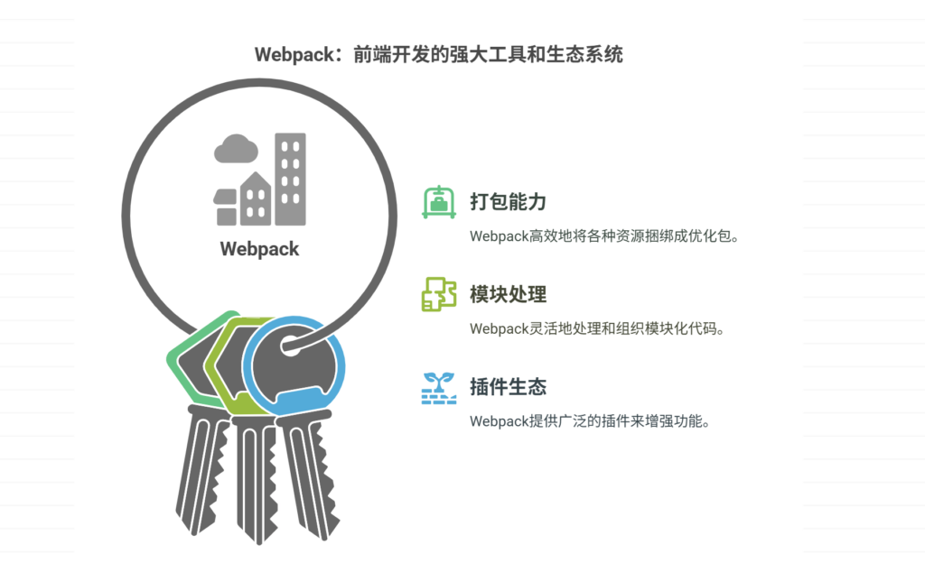 Webpack是一款现代化的前端资源模块化打包工具,因其卓越的模块处理能力、高度可定制化的配置选项及丰富的插件生态系统,深受全球开发者的喜爱。Webpack的核心优势在于将各种不同类型的前端资源(JavaScript、CSS、图片)视为模块进行管理,提供代码分割、懒加载、缓存优化等功能,有效提高了前端应用的性能。