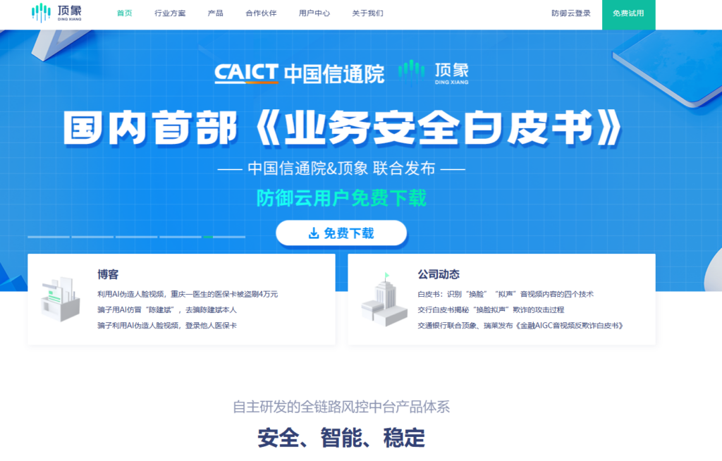顶象安全是国内领先的业务安全公司,致力于帮助企业构建自主可控的业务安全体系,解决伪造、篡改、劫持、冒用、虚假制作等业务欺诈威胁,防范化解各类网络黑灰产风险,让业务更加健康稳定,助力企业创新与增长。