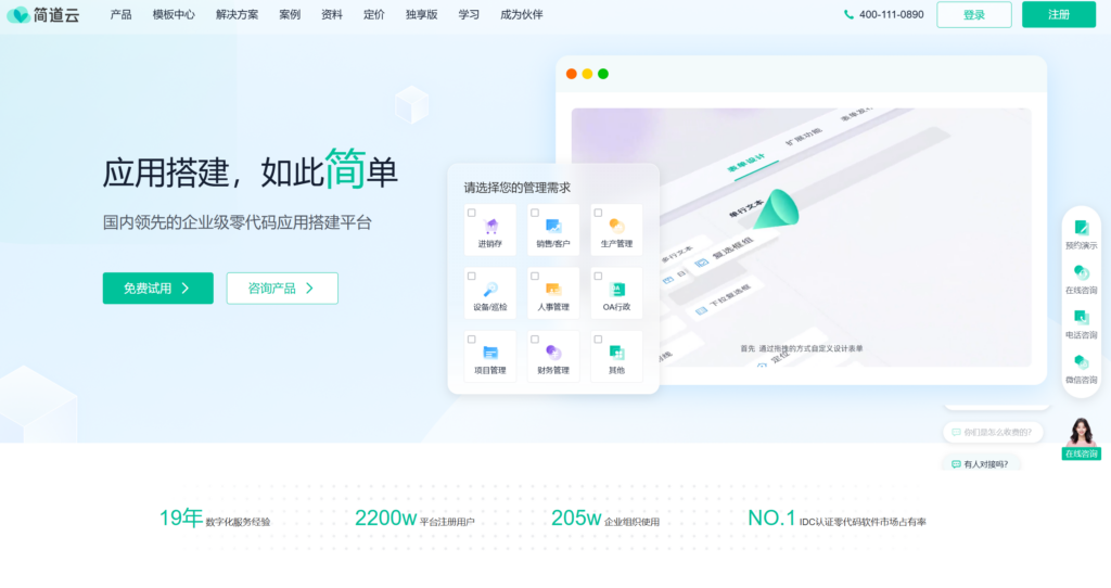 简道云是一款零代码轻量级的企业级应用搭建平台,旨在帮助企业快速构建个性化的管理系统,如 CRM、ERP、OA、项目管理、进销存等。通过可视化的拖拽界面,用户无需编程基础即可搭建符合自身需求的应用,广泛应用于制造、零售、建筑、能源、教育等行业。
