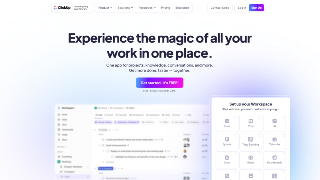 ClickUp 是一款由 Zeb Evans 和 Alex Yurkowski 于 2017 年创立的项目管理和团队协作平台,旨在通过提供一个集成的工作空间,帮助团队高效地管理任务、项目和工作流程。该平台以其高度的可定制性和灵活性,满足了各类团队在项目管理中的多样化需求。ClickUp 的目标是通过整合任务管理、文档编辑、目标设定、时间跟踪等功能,成为用户工作中的核心平台,减少在多个应用之间切换的需求。