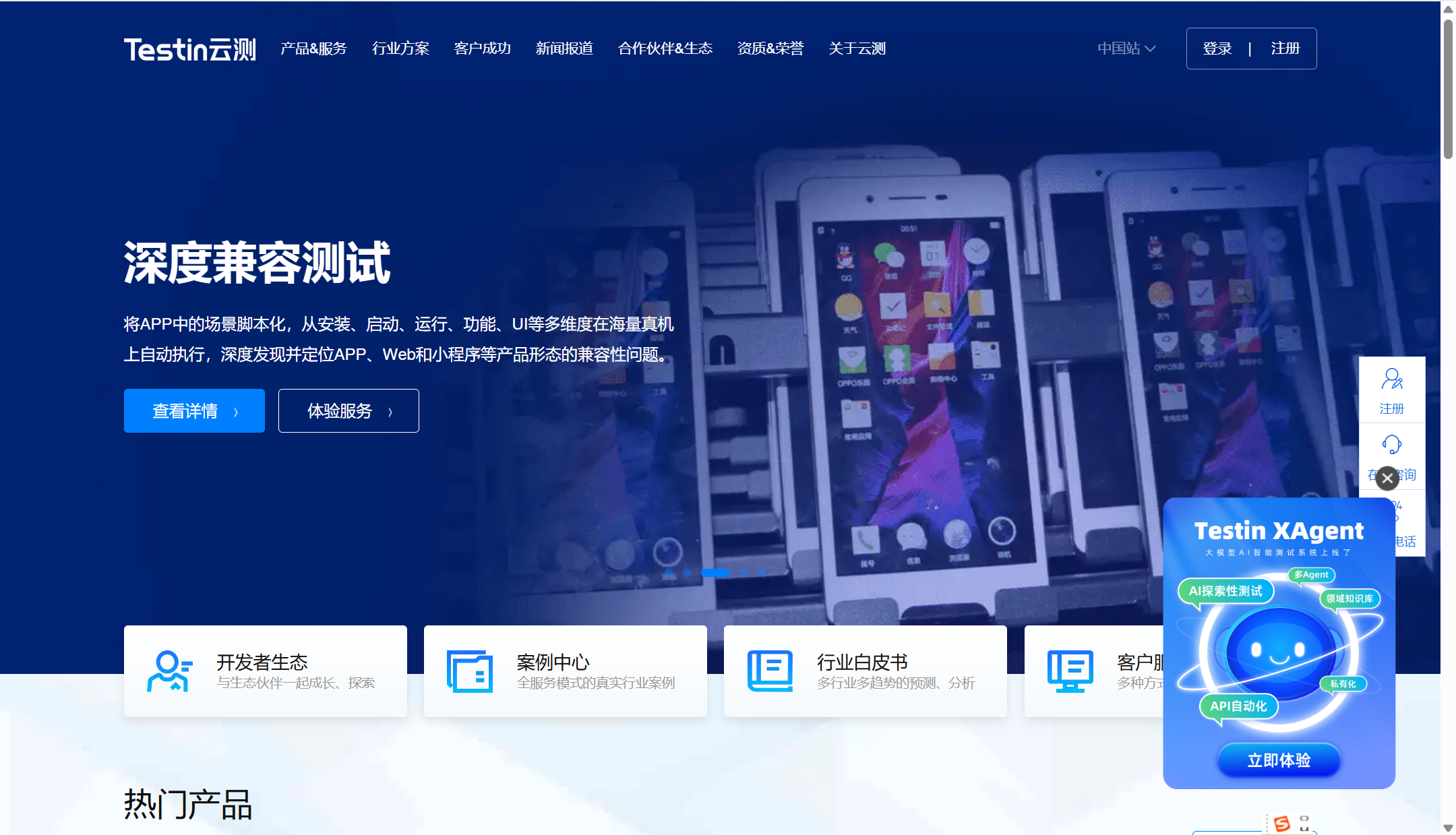 作为一家深耕云测服务的AI 驱动型测试平台,Testin云测覆盖了功能测试、兼容性测试、安全测试和性能测试等多维度场景,并通过AI 强化学习与 NLP 语义解析实现自动化测试脚本的快速生成和迭代。平台依托千余款真机设备,提供7×24小时不间断的测试服务,帮助团队在上线前深挖潜在问题,大幅提升应用质量。