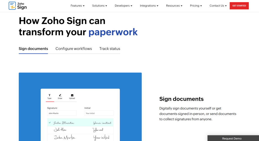 Zoho Sign 是 Zoho 公司旗下的电子签名工具,提供简洁的界面和丰富的功能,支持多种文件格式和签署方式,可与 Zoho CRM、Zoho Creator 等产品无缝集成。它的核心功能包括文档发送、签署提醒、模板管理和审计日志,用户可通过网页、移动应用或电子邮件完成签署,并实时跟踪签署进度。Zoho Sign 的优势在于其与 Zoho 生态的深度集成和性价比,适合中小企业和团队使用,同时提供多语言支持和合规性保障,满足全球用户需求。