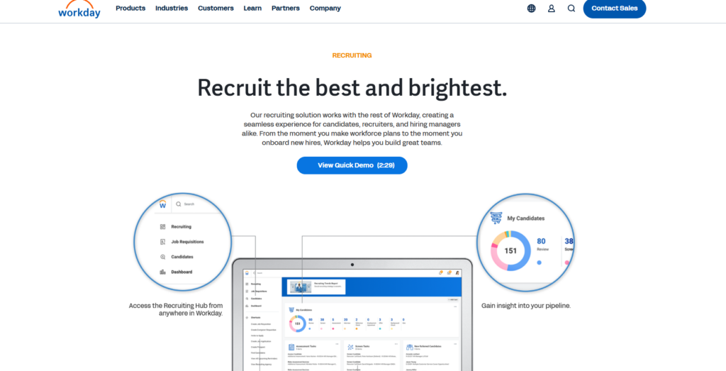Workday是一款基于云端的人才招聘管理系统,集成在其全面的Human Capital Management (HCM)平台中,为企业提供从招聘到入职的端到端解决方案。该系统通过统一的数据模型,实现招聘流程的可视化和一体化管理,帮助HR团队在一个平台内完成职位发布、候选人筛选、面试协同及Offer发放等关键环节,进而提升招聘效率和候选人体验。