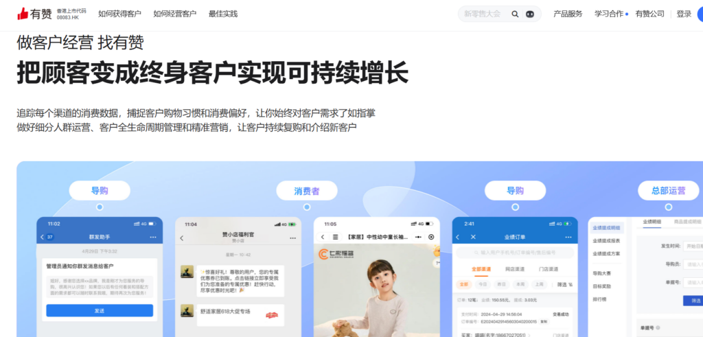 有赞CRM已服务包括宝洁、TCL、农夫山泉等众多品牌,累计赋能超 2,000,000 名销售及导购人员,覆盖 1.22 亿消费者关系,帮助商家实现会员运营、导购激励及门店连锁管理等多种场景下的业务增长。对于希望构建私域流量池、提升客户终身价值的品牌和零售商而言,有赞CRM提供了从数据采集到自动化运营的全流程支持,能够在短期内显著提升客户忠诚度与复购率