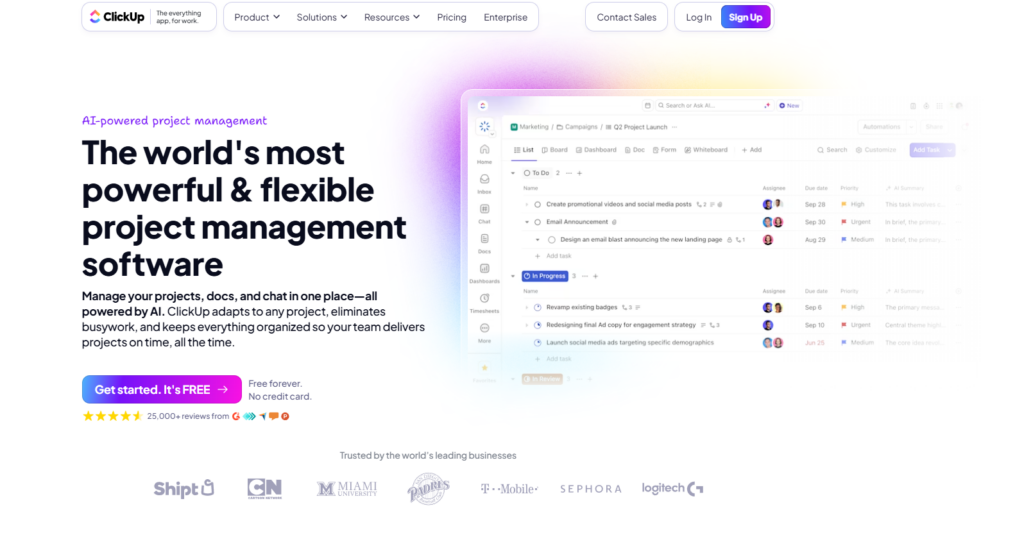 ClickUp 是一款成立于 2017 年、总部位于美国的云端项目管理平台,旨在为团队提供一站式工作空间,将任务、文档、聊天和白板等功能整合在同一界面中。它支持多种视图模式(包括电子表格、看板、甘特图和时间线),并且能够实时同步任务状态与项目进展,使团队成员无需在不同工具间切换即可管理日常工作与长期规划 。