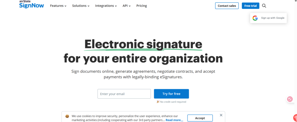SignNow(隶属 airSlate)是一款面向全球企业的电子签约平台,提供网页、移动端与 API 三种入口,主打“无限用户+按签署次数付费”的灵活计费模式:Business 8 美元、Business Premium 15 美元、Enterprise 30 美元起/人/月,超过 100 次签署邀请会另行计费。平台内置可重复使用的模板、批量发送、条件逻辑、SMS 通知与支付收款等功能,并与 Microsoft 365、Salesforce、Google Workspace 等常见业务系统深度集成,方便在原有工作流内直接发起和跟踪签约。在安全与合规层面,SignNow 通过 SOC 2 Type II、GDPR 和 HIPAA 认证,并宣称符合 ISO 27001 管控要求,所有文档都可加密存储并生成完整审计链。
