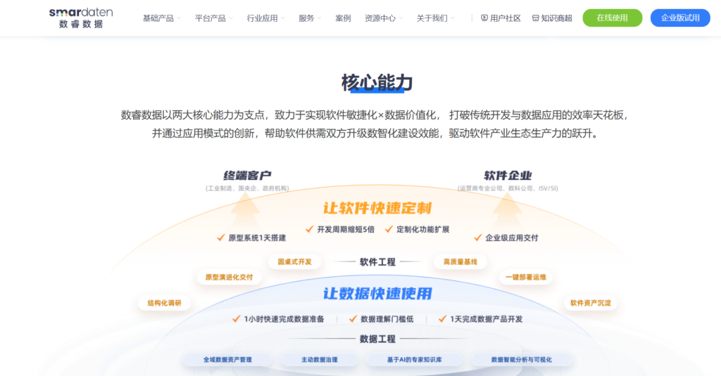 数睿数据平台优势体现在用户友好的使用体验与企业级架构支撑上。其零代码设计理念辅以“990方法论”,显著缩短项目上线周期;底层技术采用Spark+ClickHouse+Delta Lake,具备大数据处理能力与高性能实时分析支持;部署方式灵活,既可以云端SaaS,也支持私有化部署,满足安全合规需求。平台亦围绕业务场景提供标准化培训与运维支持,并拥有活跃社区助力问题解决,赢得多行业口碑